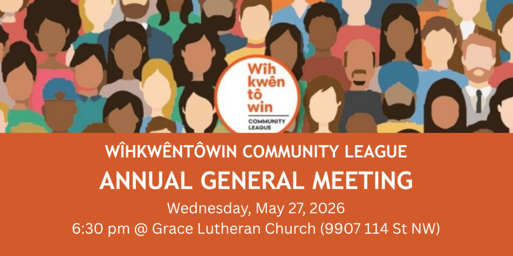 Hey there! Join us on May 27, 2026 at 6:30 PM MDT at Grace Lutheran Church for the Wîhkwêntôwin Community League’s Annual General Meeting.